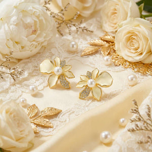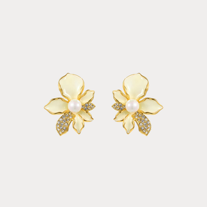 Soft ivory petals bloom in a refined iris silhouette, edged with polished gold for a delicate glow. A luminous pearl centre is paired with subtle pavé crystal leaves, adding just the right touch of sparkle. Elegant and lightweight, these stud earrings are perfect for everyday wear or special moments that call for timeless floral charm.