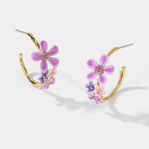 These hoop earrings gracefully present forget-me-not in a delicate arrangement, celebrating the flower's enduring symbol of love and remembrance. The soft pink and purple enamel petals, coupled with golden accents, create an accessory that's both stylish and meaningful. They're perfect for adding a floral touch to any ensemble.