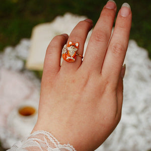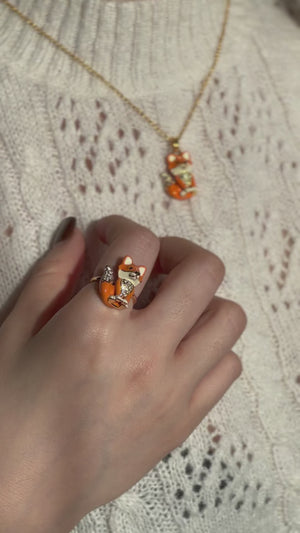 Crafted from high-quality enamel and brass, this ring features a charming fox adorned with sparkling crystals, capturing the playful spirit of nature's clever creature. The vibrant orange enamel and intricate details make this ring a standout piece, perfect for adding a touch of fun and elegance to your outfit.