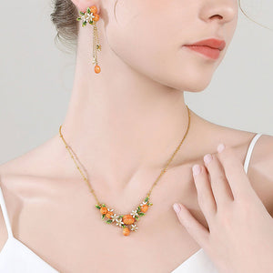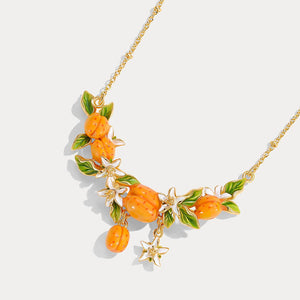 Indulge in the exquisite charm of our Golden Apricot Flower Necklace, a radiant testament to nature's opulence and artisanal mastery. Meticulously crafted with vibrant enamel, each apricot, leaf, and blossom is rendered with lifelike detail. This necklace is not just an accessory but a statement of sophistication, embodying luxury and grace.