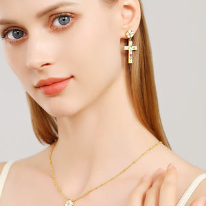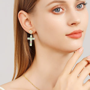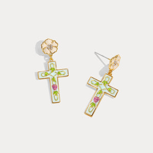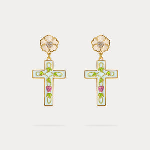 These earrings showcase a dazzling crystal cross adorned with delicate gold-plated grapevines. The soft enamel infuses a touch of color, creating an exquisite and meaningful design. Crafted with 18k gold plating, these earrings offer a lasting, elegant finish. Perfect for summer or for those looking to incorporate a touch of faith into their ensemble, these earrings blend style and symbolism beautifully.