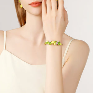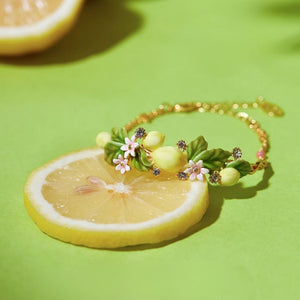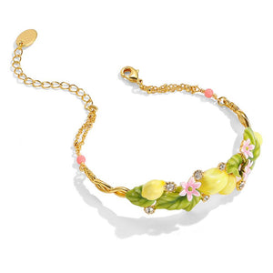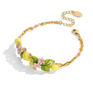This enchanting bracelet features vibrant yellow lemon charms, lush green leaves, and delicate pink blossoms, all meticulously hand-painted with fine enamel craftsmanship. Accented with sparkling stones, the bracelet adds a touch of glamour and whimsy to your look.
