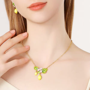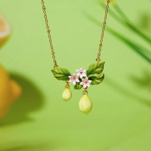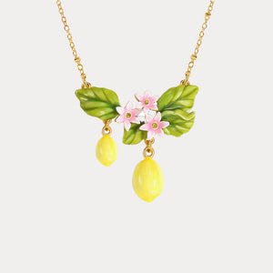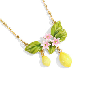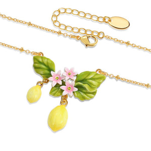 This delightful piece features a beautifully crafted arrangement of hand-painted enamel charms, including vibrant yellow lemons, lush green leaves, and delicate pink flowers. Each element is meticulously detailed, bringing the essence of a blooming lemon grove to your jewelry collection.
