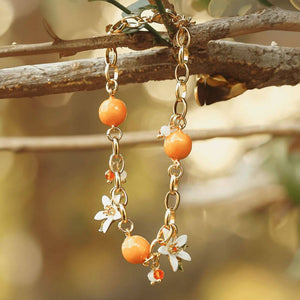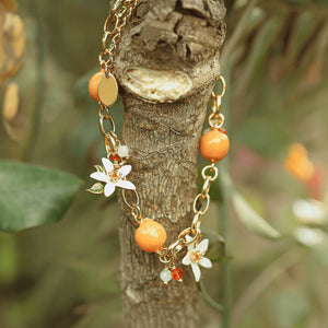 This exquisite bracelet, beautifully embellished with orange fruits and blooms, complemented by verdant leaves, paints a vivid tableau of a fruitful harvest. Wearing it promises to infuse your spirit with delight and cheerfulness. Moreover, to achieve a harmonious ensemble, consider pairing this bracelet with coordinating orange necklaces, earrings, and rings from our Verdivine collection.