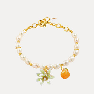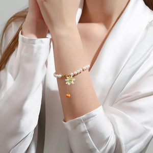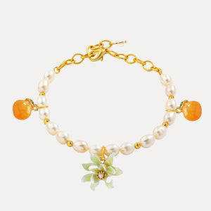 Discover the grace of a garden in bloom with this pearl bracelet, adorned with a delightful floral pendant and a vibrant orange charm. This exquisite piece evokes the freshness of a spring morning, perfect for adding a subtle statement of elegance and color to your daily wear. Its timeless design ensures it pairs beautifully with both casual and formal attire.
