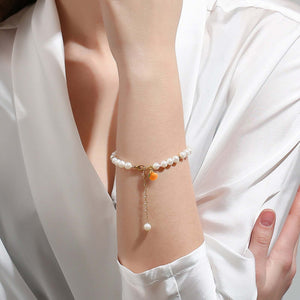 Step into a world of simple sophistication with this elegant pearl bracelet, graced with a whimsical orange charm. It's a piece that combines classic beauty with a playful touch, designed to complement a cheerful and refined look. Whether it's a casual brunch or a formal event, this bracelet will add a dash of joyful elegance to your ensemble.