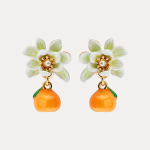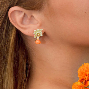 These Drop earrings are a beautiful display of white flowers paired with a hanging orange fruit charm, encapsulating a lovely bloom and harvest theme. The golden elements add a hint of luxury, making them suitable for various occasions.