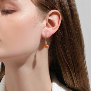 These captivating gold earrings, with their cheerful orange charms and glistening stones, are like a splash of sunshine with a touch of sparkle. They combine playful elegance and a pop of color, ideal for enhancing any outfit with a vibrant, summery vibe. Just the right blend of fun and finesse for any occasion.