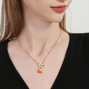 This exquisite orange necklace, where delicate orange blossoms and fruit converge, offers women a way to infuse their everyday wear with a subtle yet floral accent. The necklace's enamelled craftsmanship captures the vibrancy of both the blossom and the fruit, infusing the piece with an abundance of life and charm. It's a piece that every woman deserves to enhance her wardrobe with its delightful sweetness.
