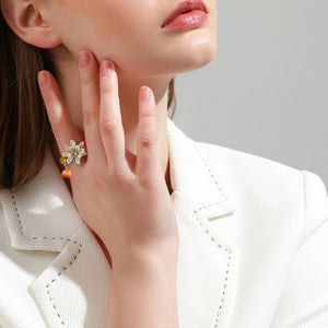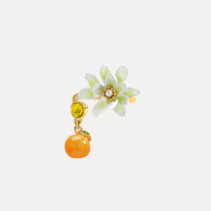 Capture the delicate beauty of spring with this single, elegant floral earring featuring a radiant orange bead. The bloom, highlighted with a pearl center and green accents, brings a touch of natural grace and freshness to your look. Ideal for adding a statement of femininity and charm to any ensemble.