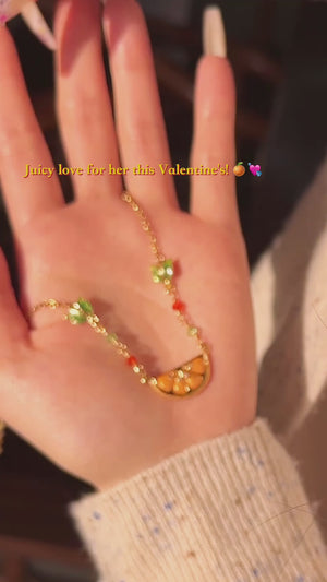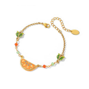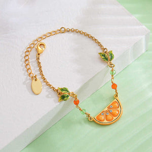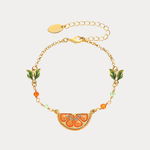This Orange Slice Bracelet brings a fresh twist to classic charm bracelets with its citrus-themed elegance. It features a central citrus slice pendant, intricately detailed with sparkling crystals to mimic seeds, enhancing its juicy appeal. The bracelet is adorned with vibrant crystal and enamel beads in shades of orange and green, interspersed with delicate leaf motifs that add a touch of natural grace.