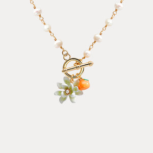 Embrace the freshness of spring with this charming gold necklace, elegantly strung with creamy pearls and punctuated by a lively orange charm. Accompanied by a sweet floral pendant, it’s a piece that promises to add a burst of seasonal joy and a pop of color to your attire, making it an ideal accessory for both daytime delights and evening elegance.