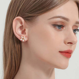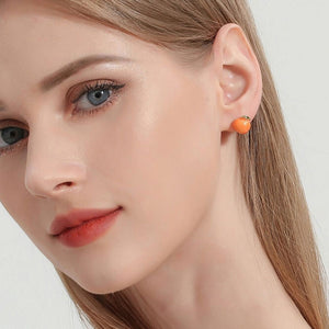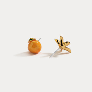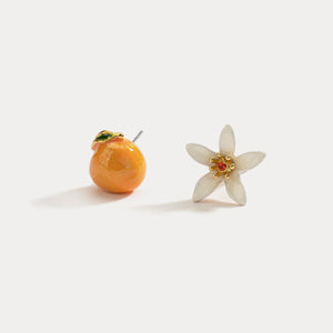 These whimsical mismatched earrings pair a single white flower stud with a charming orange fruit stud, merging botanical beauty with a playful touch. The bright colors and creative design make for a fun and fresh addition to any jewelry collection.
