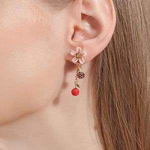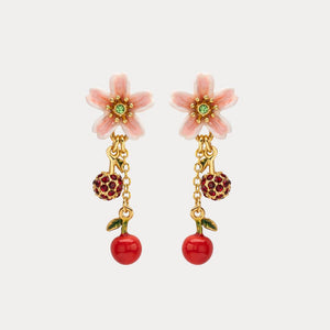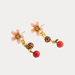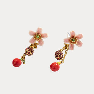 Each earring features a delicate peach blossom adorned with sparkling green stone accents, gracefully complemented by dangling cherries and ruby-studded orbs. The combination of soft pink petals and vibrant red cherries brings a playful yet elegant touch to your look, making these earrings perfect for both casual and formal occasions.