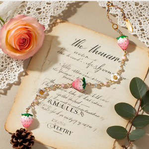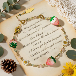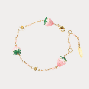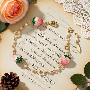 Sweeten your style with this Pink Strawberry Bracelet. Adorned with hand-painted enamel strawberries in soft pastel pink, delicate white blossoms, and golden accents, it captures the charm of a summer garden. The dainty beaded chain adds a touch of elegance, making it a playful yet refined accessory. Perfect for adding a fruity, feminine flair to your everyday look or gifting to someone special.