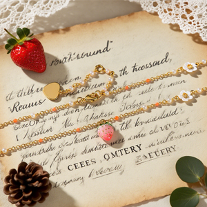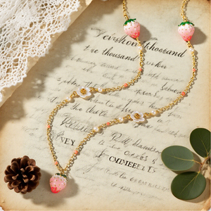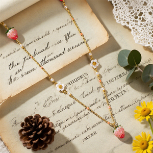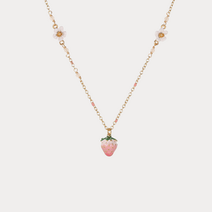 Celebrate sweetness and charm with this Pink Strawberry Necklace. The delicate gold chain is adorned with alternating white blossoms featuring golden centres and playful pink beads, adding a lighthearted elegance. The standout elements are two hand-painted enamel strawberries in soft pink, meticulously detailed with golden seeds and topped with lifelike green leaves.