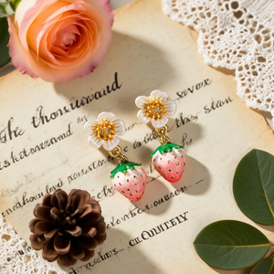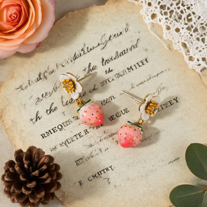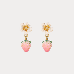 Celebrate sweetness and charm with these Strawberry Blossom Earrings. Each earring features a delicate white flower with a golden centre, holding a dangling hand-painted enamel strawberry in soft pink with golden seed details. The playful yet elegant design combines fruity freshness with floral beauty, making them the perfect accessory for adding a whimsical touch to your everyday style.