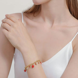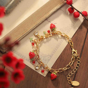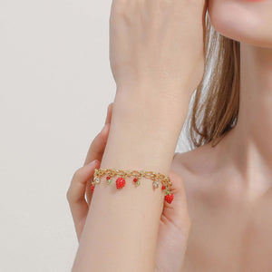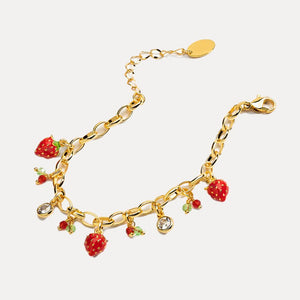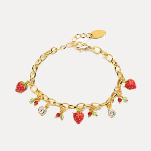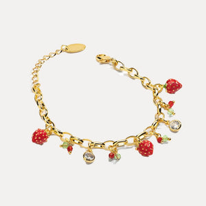 Adorning the wrist with a delightful cascade of golden links, this bracelet playfully intersperses enamelled strawberry charms with gleaming accents. Reminiscent of a stroll through sun-drenched fields, it's an accessory that brings a touch of the sweet abundance of summer to any day. Each strawberry, detailed and vivid, hangs alongside twinkling embellishments, creating a piece that's as suitable for everyday elegance as it is for accenting a festive occasion.