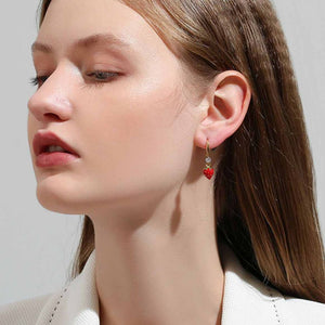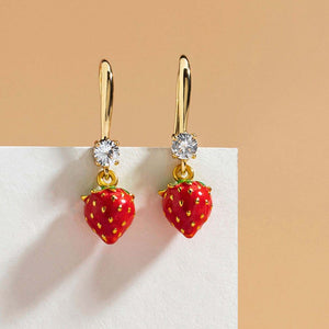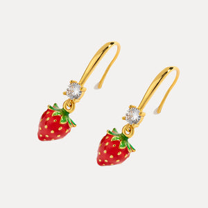 These earrings highlight a sparking stone that gracefully leads to a vivid strawberry charm. Painted in a glossy red and accented with touches of green, the strawberries infuse a sense of playful elegance and summery flair into any ensemble.
