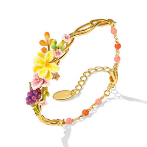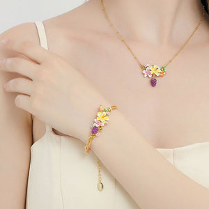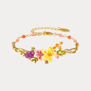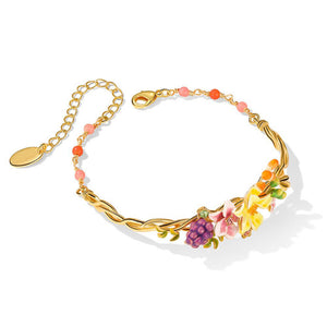 This bracelet features a delightful arrangement of grape and flower charms, each radiating with lively colors. Perfect for both special occasions and everyday elegance, this luxurious piece seamlessly blends cottagecore aesthetics with timeless sophistication. Gift yourself or a loved one this exquisite bracelet, and let the charm of nature elevate any ensemble.
