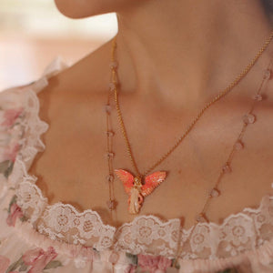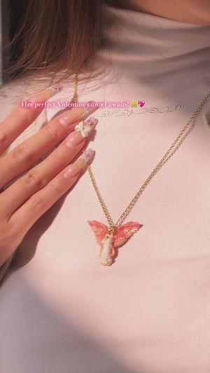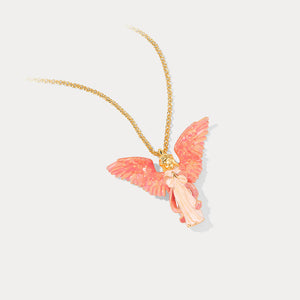 Crafted with meticulous detail, this stunning piece features an ethereal angel adorned with delicate pink wings, gracefully suspended from a gold-plated chain. The soft hues and intricate design make this necklace a perfect symbol of serenity and beauty, adding a touch of heavenly charm to any outfit. Ideal for everyday wear or as a meaningful gift, this necklace embodies the grace and elegance of angelic presence.