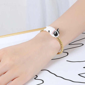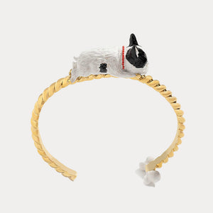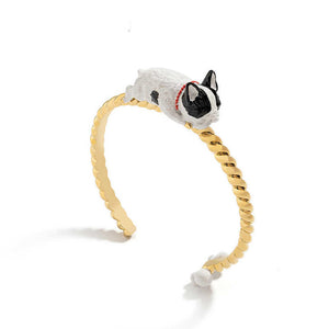 This charming Bulldog Bracelet is the perfect accessory for dog lovers. Featuring a playful black and white bulldog figurine, the bracelet combines whimsical design with elegance. The gold-tone, twisted cuff band adds a sleek, luxurious feel, while the adorable bulldog rests atop, giving it a unique character.