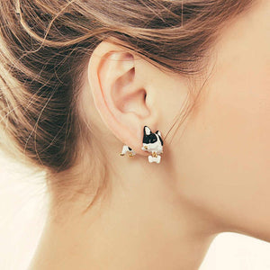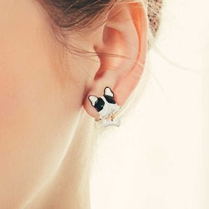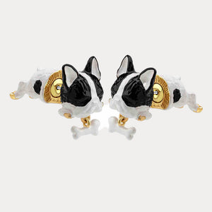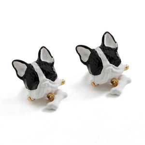 Crafted with attention to detail, each earring features a cute black and white bulldog in a resting pose, complete with a tiny bone dangling beneath. The enamel finish gives the earrings a glossy and vibrant appearance, making them a perfect accessory for dog lovers.