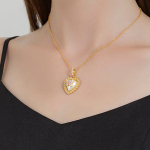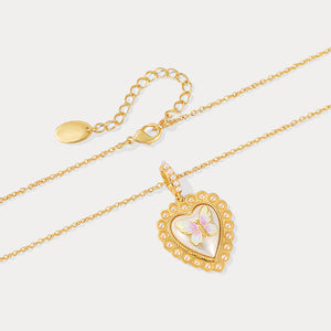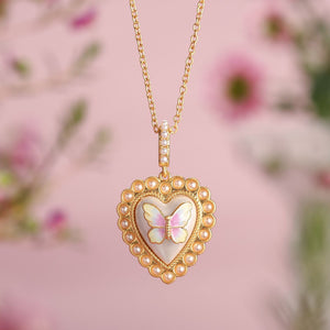 This necklace features a heart-shaped pendant with a delicate enamel butterfly at its center, surrounded by tiny pearls for added sophistication. Perfect for any occasion, this necklace symbolizes love and transformation, making it an ideal gift or a luxurious addition to your jewelry collection.