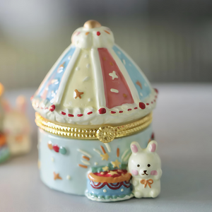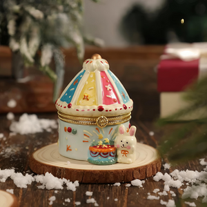 Featuring a charming carousel design adorned with vibrant colors and intricate patterns, this enchanting piece is paired with an adorable bunny companion. The detailed craftsmanship makes it a perfect keepsake box for small treasures or jewelry. Whether as a playful addition to your decor or a heartwarming gift, this trinket box will bring a touch of wonder and joy to any space.