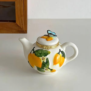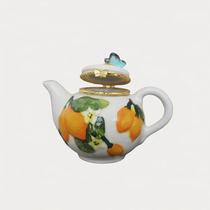Featuring vibrant orange fruit details and lush green leaves, this teapot-shaped trinket box exudes a cheerful and sunny vibe. Topped with a golden bow hinge, it opens to reveal a small compartment perfect for storing tiny treasures or keepsakes. This unique piece is both functional and decorative, making it an ideal gift or addition to your collection.