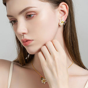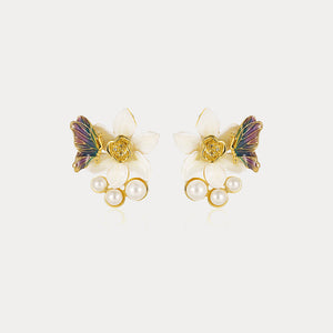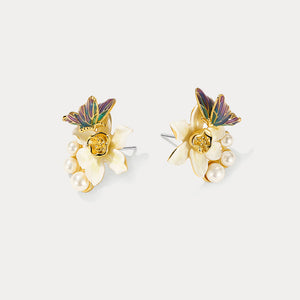 These earrings feature exquisite hand-crafted daffodils adorned with delicate butterflies, all detailed with vibrant enamel and shimmering pearls. Perfect for adding a touch of springtime charm to any outfit.
