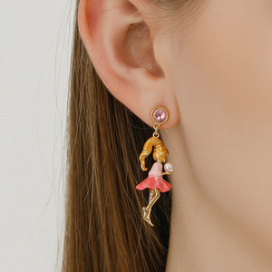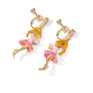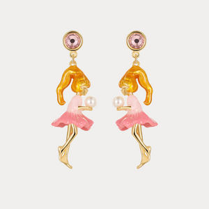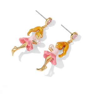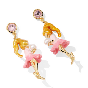 These charming earrings feature a graceful dancer in a pink dress, hand-enameled with intricate details. The dancer holds a lustrous pearl, symbolizing purity and beauty. The design is completed with a sparkling pink stone at the top, adding a touch of glamour.