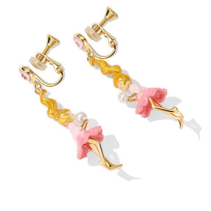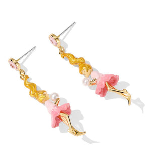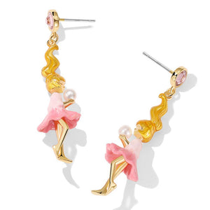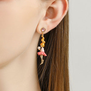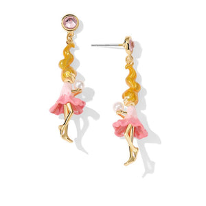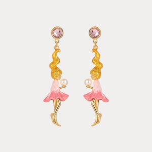 These charming earrings feature a delightful girl in a pink dress, gracefully holding a lustrous pearl. The girl's golden hair and delicate enamel detailing create a magical allure, while the pink stone stud adds a sparkle of sophistication.