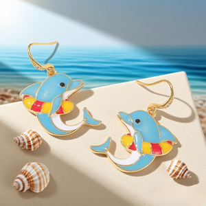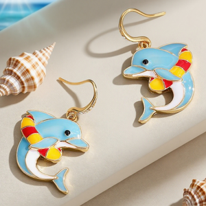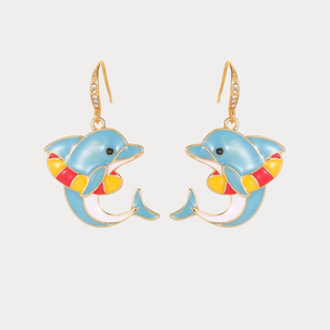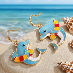 Bring a splash of joy to your style with these playful Dolphin Earrings. Featuring a charming blue dolphin design with a colourful red and yellow lifebuoy, they capture the fun spirit of the sea. Glossy enamel detailing and gold-tone accents make them vibrant and eye-catching, while the sparkling hooks add a touch of elegance. Perfect for ocean lovers and anyone who adores whimsical, nautical-inspired jewellery.