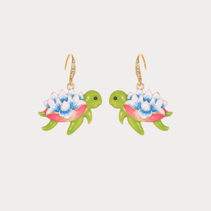 Celebrate ocean charm with these whimsical Flower Turtle Earrings. Each piece features a sweet green turtle carrying a vibrant pink-and-blue flower on its shell, crafted with glossy enamel and highlighted by sparkling gold-tone hooks. Playful yet elegant, they capture the spirit of sea life and blooming nature in one delightful design. Perfect for ocean lovers and those who enjoy unique, statement jewellery with a touch of fun.