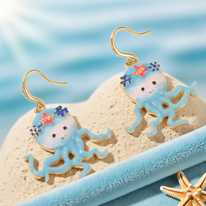 Make a splash with these delightful Ocean Octopus Earrings. Crafted with glossy enamel and gold-tone accents, each earring features a smiling octopus adorned with tiny starfish and floral details. The playful design captures the charm of ocean life, while the sparkling hook adds a touch of elegance. Perfect for sea lovers and anyone who enjoys whimsical, ocean-inspired jewellery.