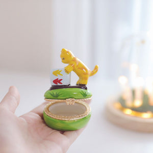 Featuring a charming yellow cat curiously pawing at a fish tank, this hand-painted design captures a delightful moment of feline playfulness. The vibrant green base opens up to reveal a hidden compartment, ideal for keeping small treasures or jewelry. With its intricate detailing and joyful theme, this trinket box makes a perfect gift for cat lovers or a playful addition to your collection.