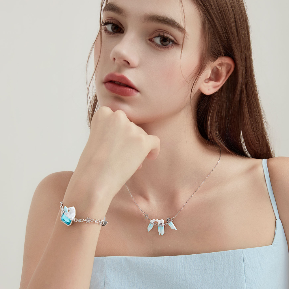 Tender and symbolic, the Polar Bear Necklace features a heartwarming scene of a mother and cub standing on icy blue enamel glaciers, accented with delicate silver snowflakes. Crafted in sterling silver, it symbolises love, protection, and the fragile beauty of nature. A meaningful statement piece that blends storytelling with elegance.