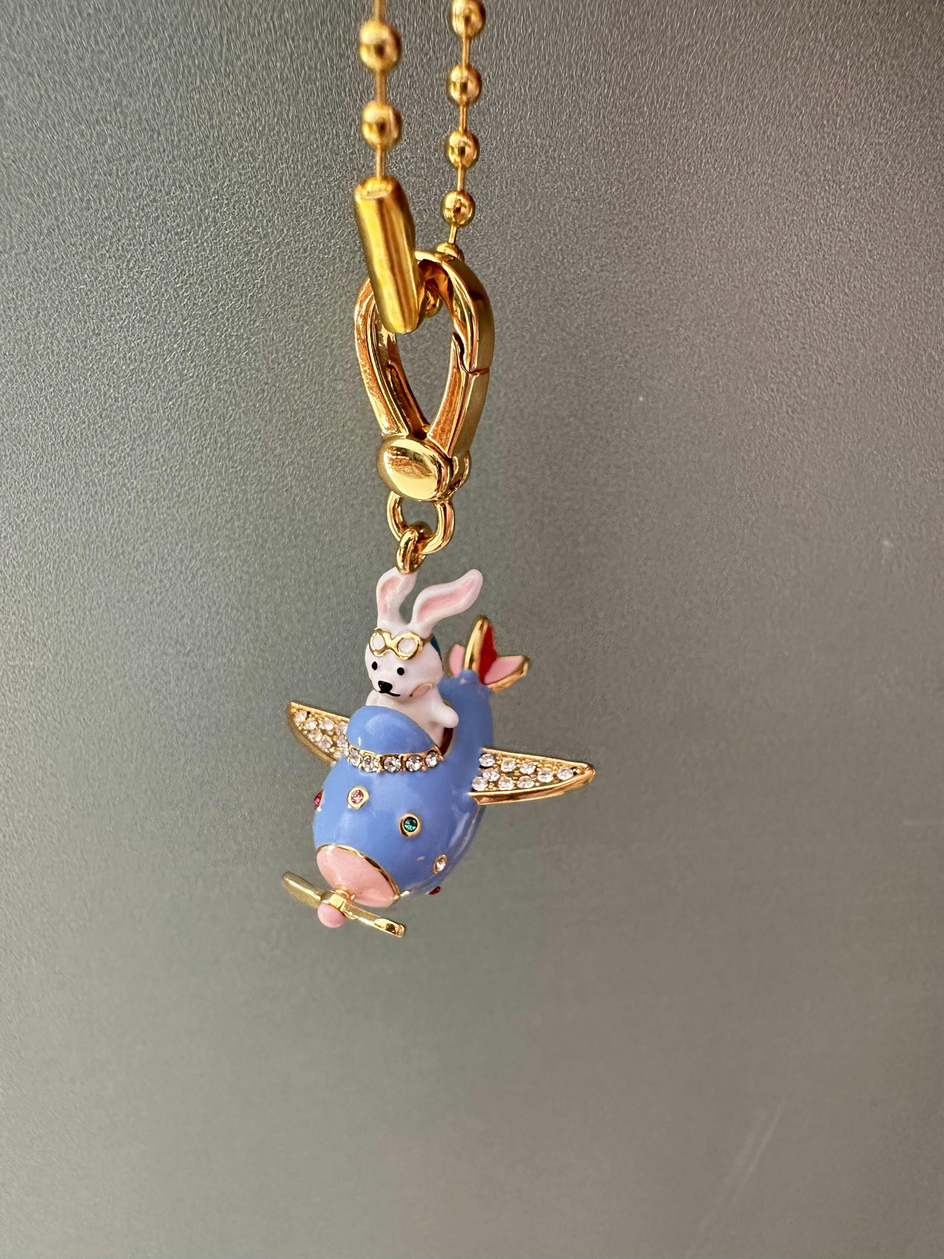 Featuring an adorable bunny donning aviator goggles, seated in a charming blue airplane adorned with sparkling crystals, this pendant is a playful and whimsical accessory. Perfect for aviation enthusiasts or those who love unique and fun designs, it adds a touch of adventure to your look.