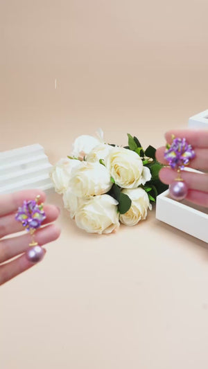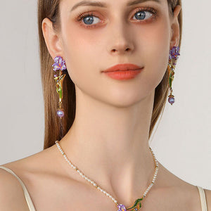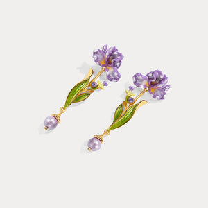 Featuring a stunning iris flower with a refined enamel finish, these earrings add charm to any outfit. The iris blooms in shades of blue and purple, reminiscent of a bird's fanned tail or a butterfly's wings. Delicate leaves adorned with blue and purple gems enhance its romantic allure. Crafted with shimmering gemstones and 18K gold, these unique earrings transport you to a magical garden of style and sophistication.