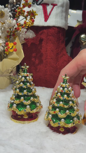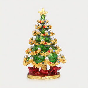 Add a touch of festive elegance to your home with this stunning Christmas Tree Trinket Box. Beautifully crafted with vibrant green enamel, this tree is adorned with delicate pearl accents, sparkling gems in festive colors, and intricate gold detailing. The star-topped design sits on a golden base, hiding a charming secret compartment perfect for storing small treasures or keepsakes. Whether as a delightful gift or a centerpiece for your holiday décor, this trinket box is a timeless symbol of the Christmas spirit, radiating joy and elegance.