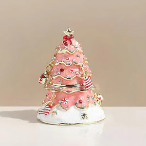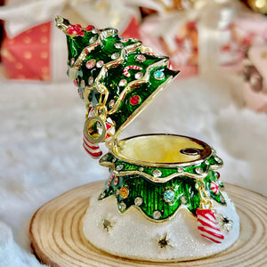 Add a festive sparkle to your holiday decor with this exquisite Christmas Tree Trinket Box. Embellished with shimmering stones, candy cane charms, and a golden star atop, this enchanting piece opens to reveal a small compartment perfect for storing keepsakes or tiny treasures.
