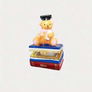 Celebrate milestones with this graduation-themed teddy bear trinket box. The scholarly bear is perched atop a stack of books, complete with a graduation cap and diploma. A meaningful keepsake for graduates to commemorate their special achievement.