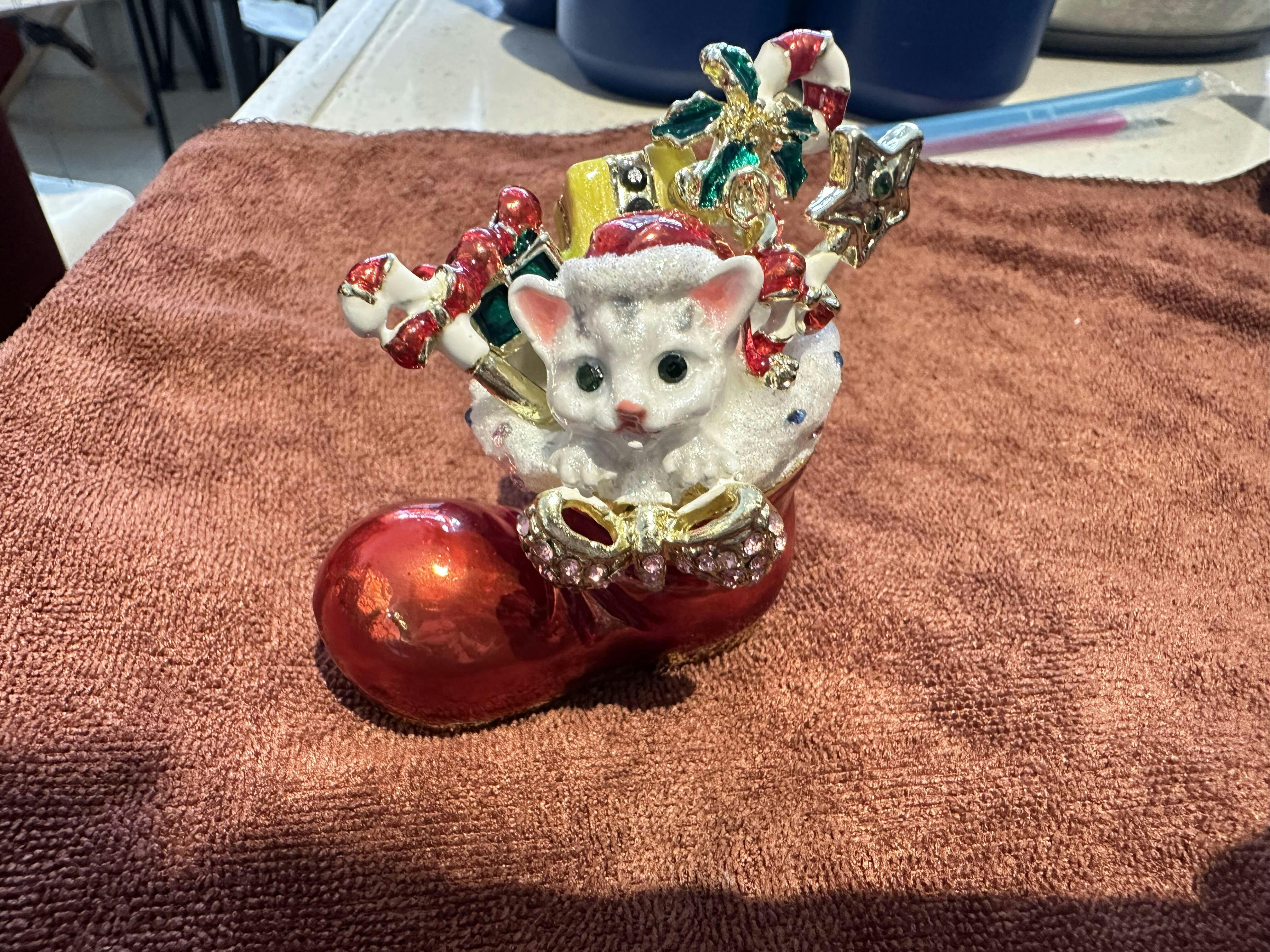 Celebrate the festive season with this delightful Santa’s Christmas Boot & Cat Trinket Box. Featuring a vibrant red boot adorned with sparkling gems and a charming bow, this trinket box is brimming with holiday cheer. A playful kitten, wearing a Santa hat, peeks out of the fluffy snow-topped boot filled with Christmas treasures like candy canes, stars, and wrapped gifts. This trinket box captures the magic of Christmas with exquisite detail, making it a perfect keepsake for the holiday season. A charming addition to any festive decor or a thoughtful gift for loved ones.
