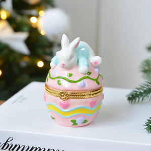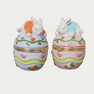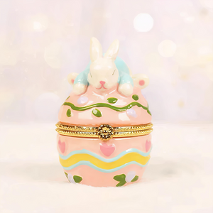 This pastel pink egg is beautifully adorned with whimsical designs, including hearts, floral accents, and bright patterns. On top, a sweet bunny rests peacefully, adding a delightful touch of springtime magic. The hinged egg opens to reveal a small compartment, perfect for holding jewelry, candies, or tiny keepsakes.