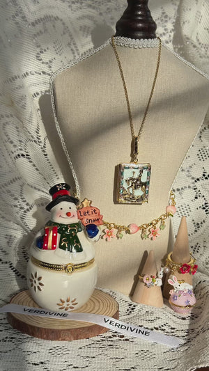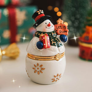 Featuring a delightful snowman dressed in a festive green scarf and black top hat, this trinket box is the perfect addition to your winter decor. Holding a cheerful "Let It Snow" sign and holiday gifts, the snowman radiates warmth and holiday spirit. The hinged design opens to reveal a small compartment, perfect for storing jewelry or tiny treasures.