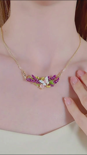 Our Lavender Butterfly Necklace is a masterpiece crafted from fine brass and enamel, showcasing nature's captivating beauty. The delicate butterfly and vibrant blossom pendant, adorned with a sparkling pink stone, symbolize wild love and eternal passion. With subtle hints of color and a cottage-inspired design, it’s the ideal gift for a loved one. Perfect for summer, this necklace blends gentle and lively elements, making it a special and unique addition to your collection. Embrace nature's charm with this timeless accessory.