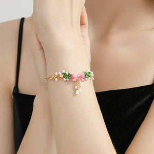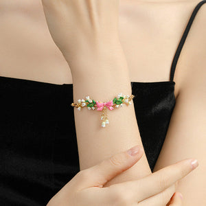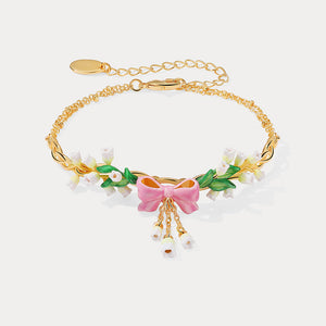 This delicate bracelet features a beautifully enamelled pink bowknot adorned with charming lily of the valley flowers and lush green leaves, meticulously crafted to create a timeless design. The 18K gold-plated chain adds a touch of luxury, making it a perfect accessory for any occasion. Embrace the romantic and sophisticated beauty of this bracelet and let it add a touch of nature-inspired elegance to your ensemble.