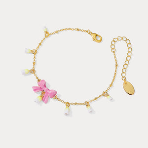 This bracelet features beautifully hand-enamelled lily of the valley flowers, each with its white bell-shaped blooms, perfectly complemented by a dainty pink bowknot. The intricate details and vibrant colors make this bracelet a stunning addition to any jewelry collection, adding a touch of femininity and sophistication to your outfit. Ideal for any occasion, it’s a perfect gift for someone special or a lovely treat for yourself.