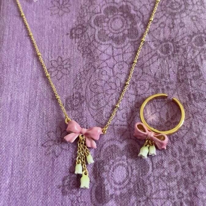 This necklace features a finely crafted pink enamel bowknot adorned with cascading white lily of the valley flowers. The flowers, symbolizing purity and sweetness, hang gracefully from a gold-plated chain, creating a sophisticated yet playful look. Perfect for adding a touch of femininity to any outfit, this necklace is an ideal gift for someone special or a beautiful addition to your own jewelry collection.